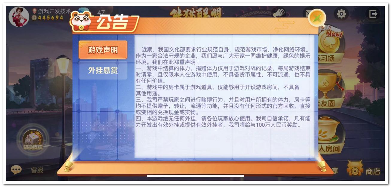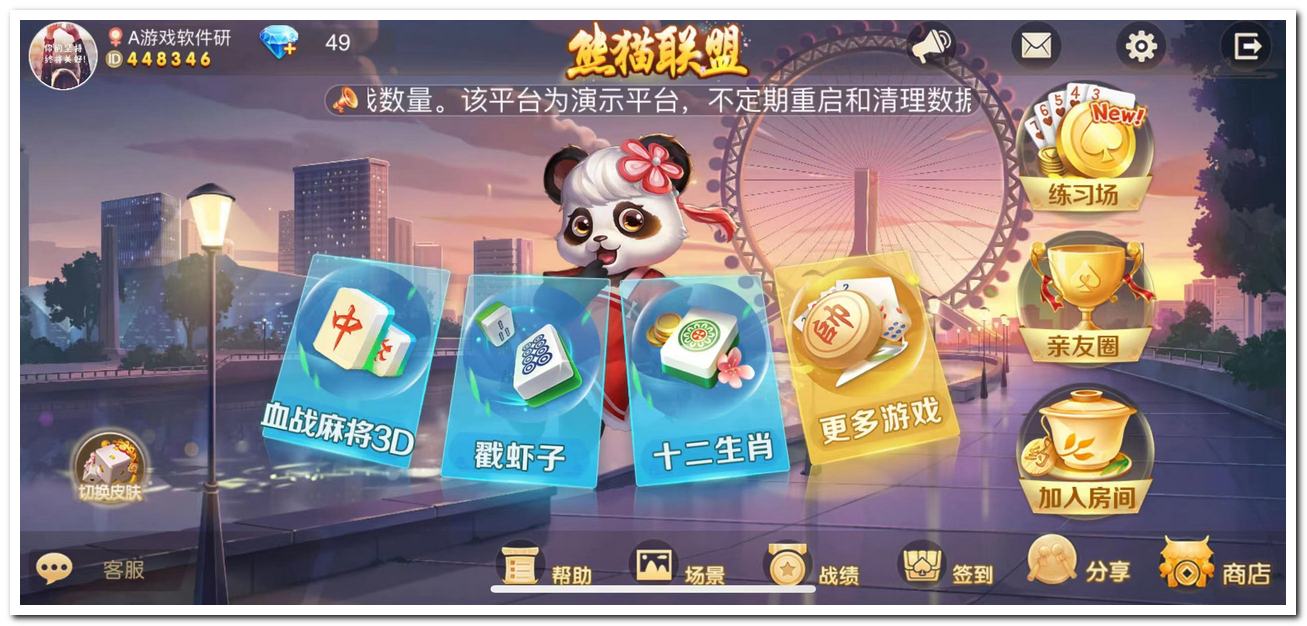 熊猫版本版本分类:房卡亲友圈安装大小:161MB热卖指数:715820支持系统:关键词:房卡大联盟麻将俱乐部亲友圈下载页面苹果下载安卓下载产品界面产品简介动态加载内容目前一共11款UI皮肤,子游戏140多个(更新中)版本名称熊猫联盟大厅功能亲友圈、客服、签到、战绩、分享、商店、设置、个人中心、加入房间、创建房间后台功能玩家管理、邮件管理、亲友圈、练习场、系统设置、运维功能、用户统计、游戏统计、房卡消耗、注册人数等等运行系统ubunt16.04前端语言cocos.js后端语言Go数据库MySQL子游戏加载中...相关应用镜象聚友版本百游版本熊猫版本百棋奕战百旗潮玩(只支持安卓测试)情怀版本玩呗千古情(手机注册不用填手机号)魔胤版本